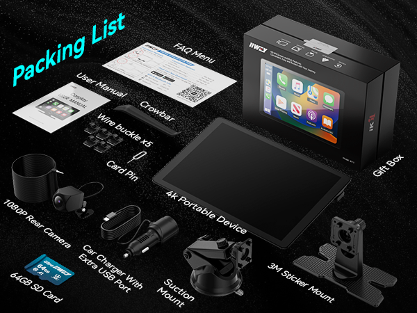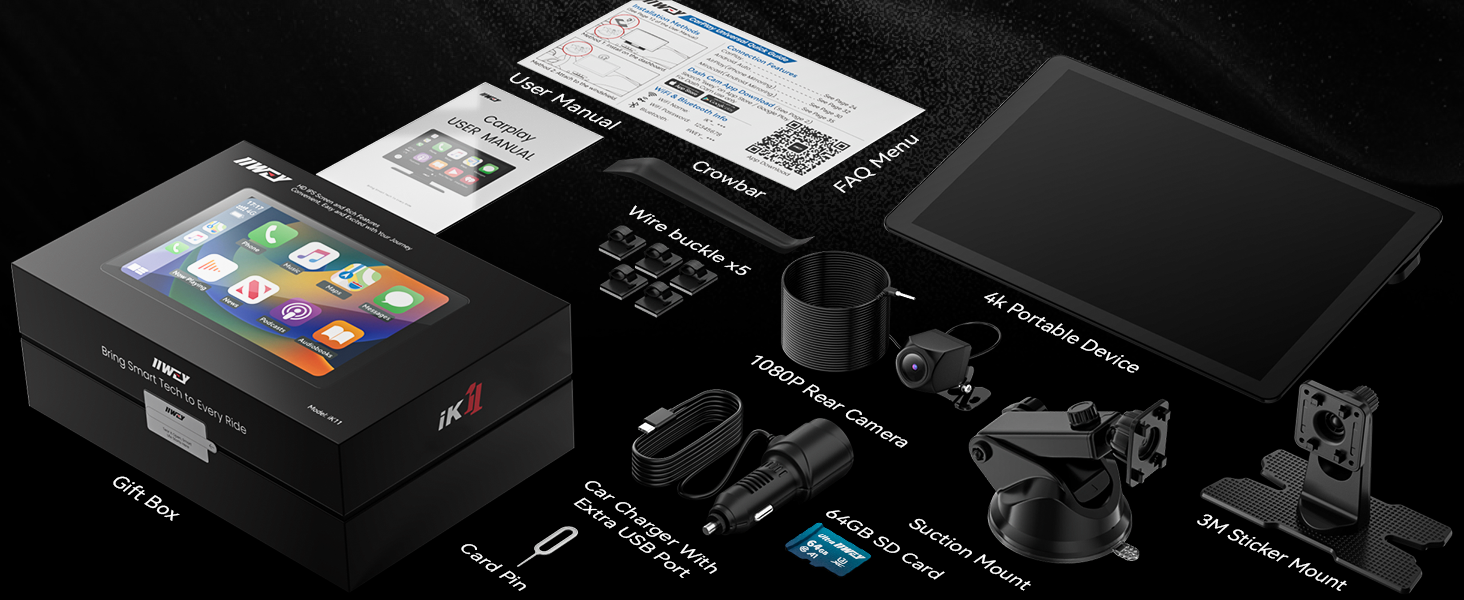 - ⭐【4K Dashcam + 1080P Rear Camera – Portable CarPlay with Built-In 64GB Storage】 The iK11 comes equipped with a 4K front dashcam and 1080P rear camera, providing comprehensive road coverage in both directions. This portable CarPlay system includes a pre-installed 64GB high-speed memory card, ensuring you can record and store footage right out of the box. With Wi-Fi video transfer, reviewing or saving clips to your phone is effortless—ideal for safety, travel, and insurance needs.