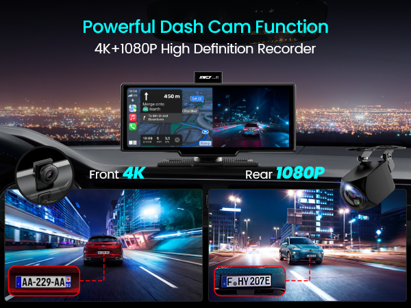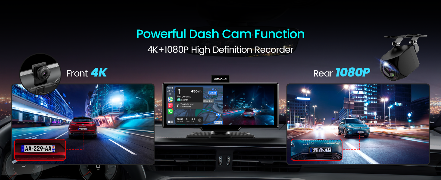 - 【4K Advanced Dashcam with Seamless Wifi Connectivity】IIWEY iK7 car stereo prioritizes safety and convenience with an integrated 4K dashcam. Capture high-resolution footage of the road ahead and your surroundings with the front and rear cameras. The wireless portable CarPlay screen allows for easy Wi-Fi connectivity, enabling instant downloading and sharing of footage to your smartphone. The included 64GB memory card provides ample storage for all your driving memories.